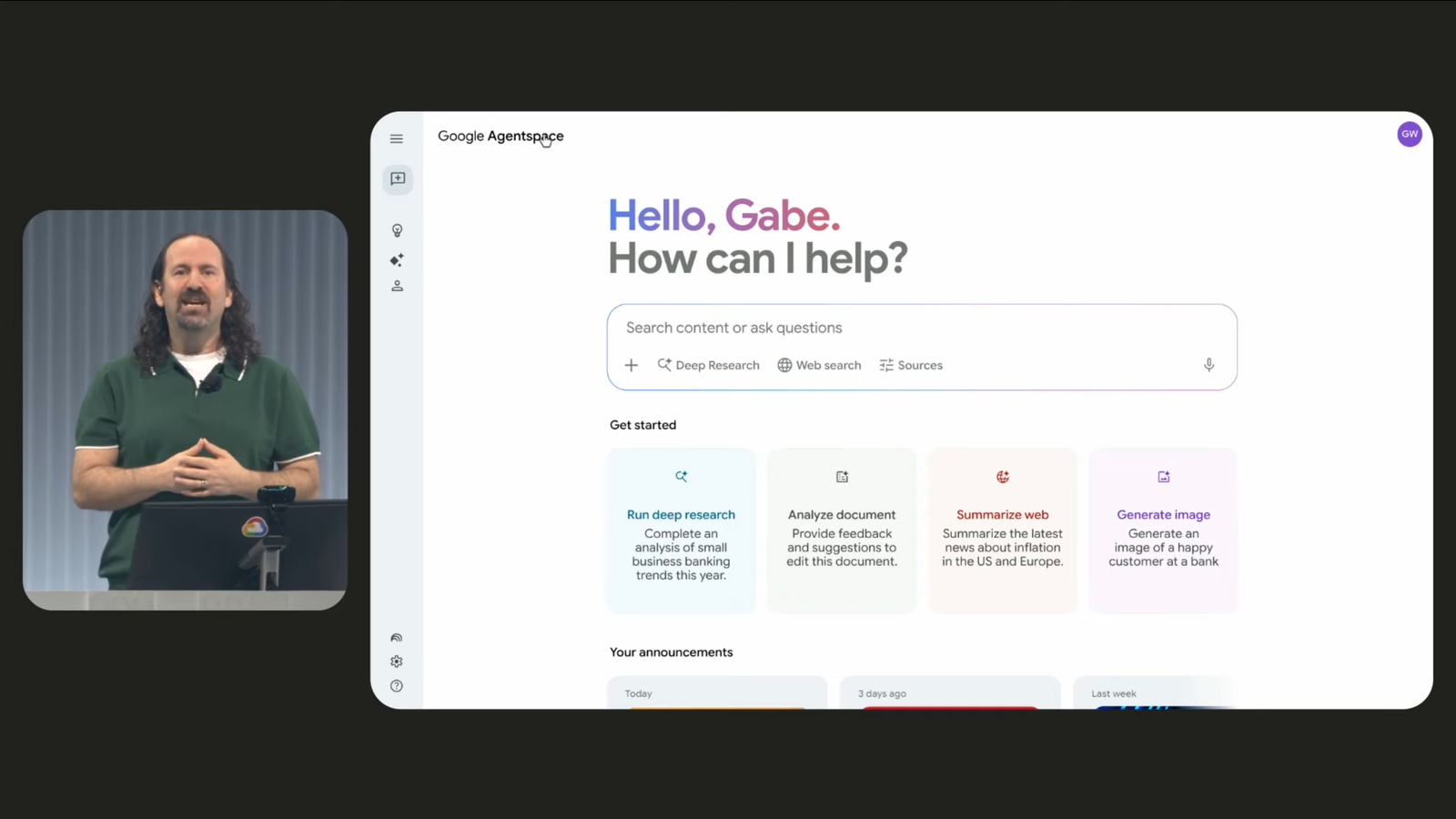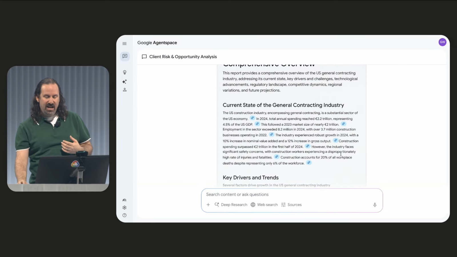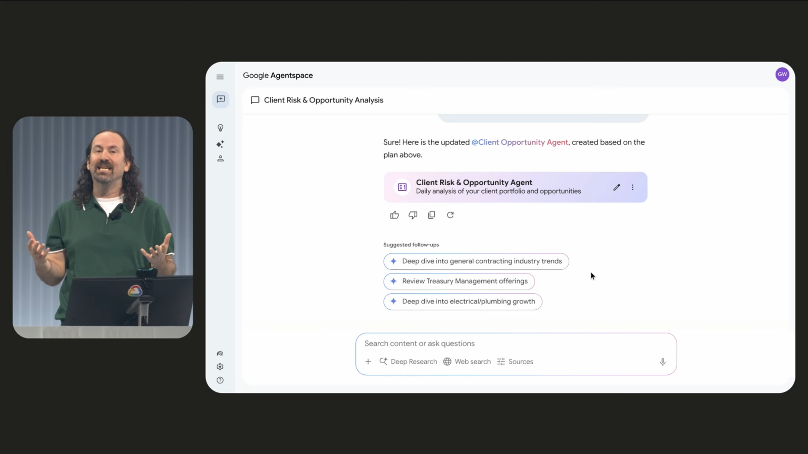 - Agentspace is integrated with Google’s enterprise deep research agent, which pulls real-time information from Google Search and internal enterprise data to build a report and provides a succinct executive summary.