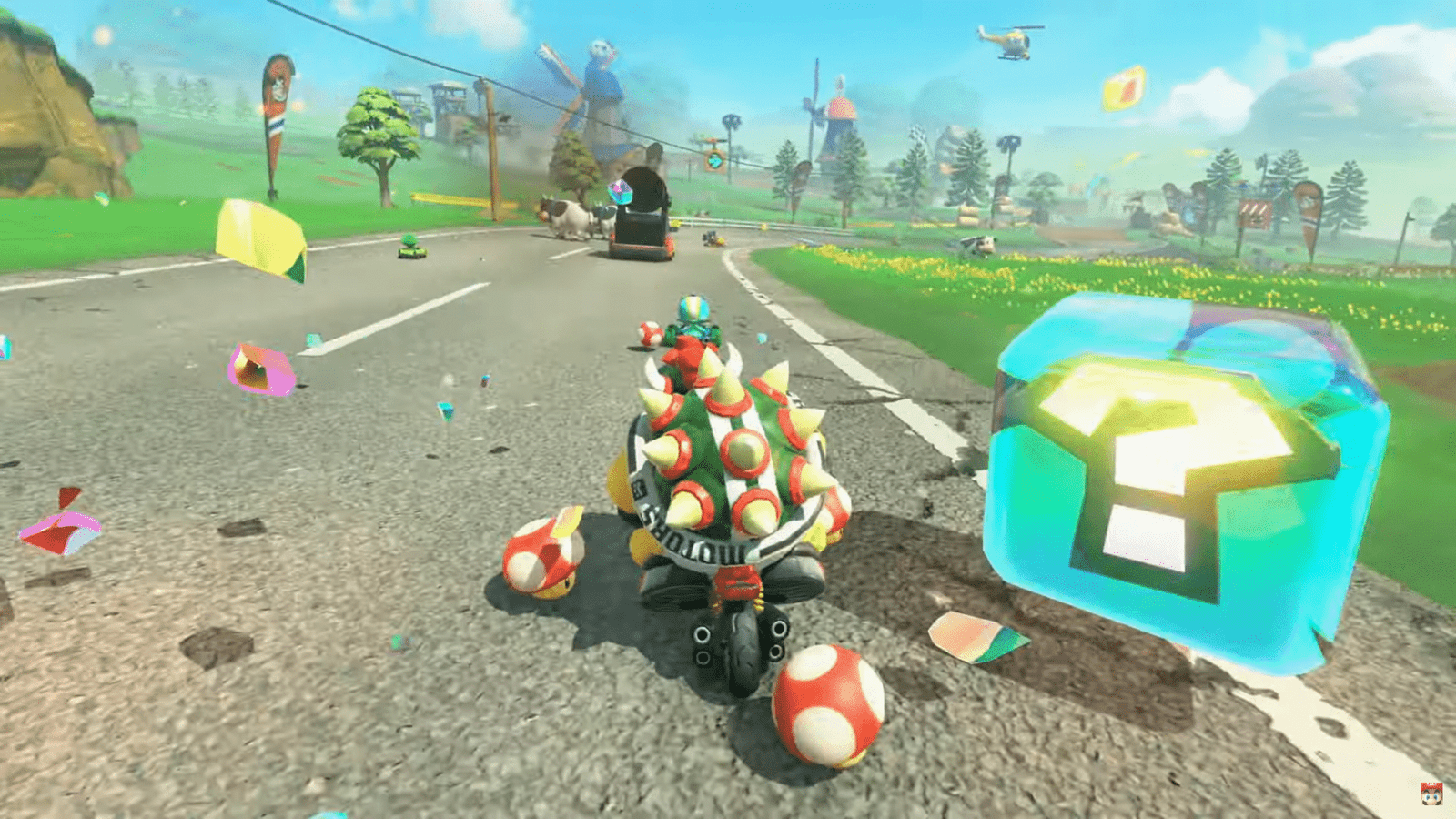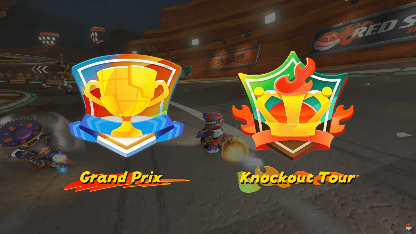 The game includes two main styles of race: Grand Prix and Knockout Tour, with up to 24 drivers able to participate, and features new items like Coin Shell, Ice Flower, and Mega Mushroom to change the outcome of a race.