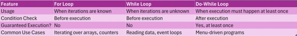 4. Comparison: For vs. While vs. Do-While