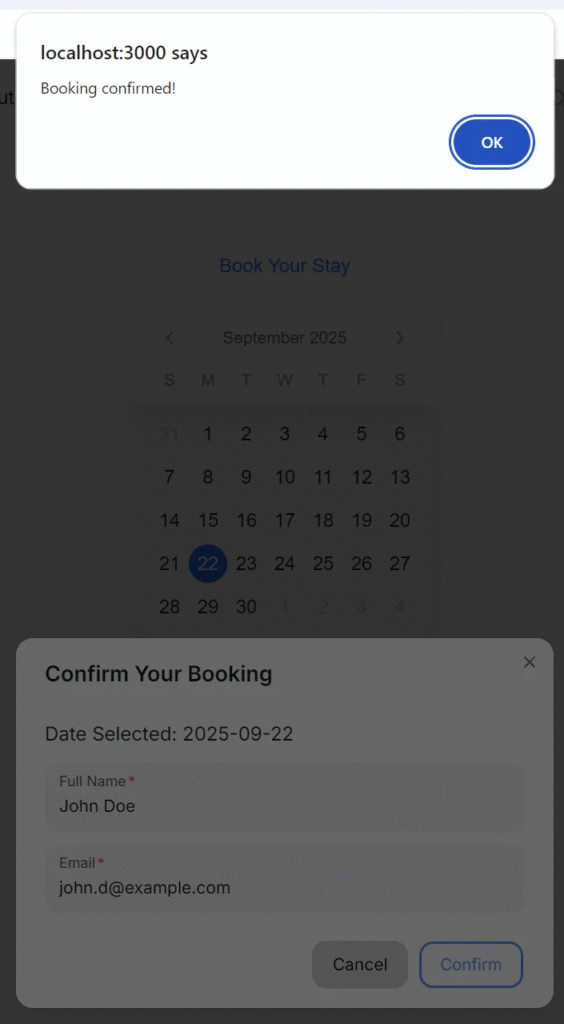 };Now your booking system sends real data to the backend. You can later connect this to a database like PostgreSQL or MongoDB.
